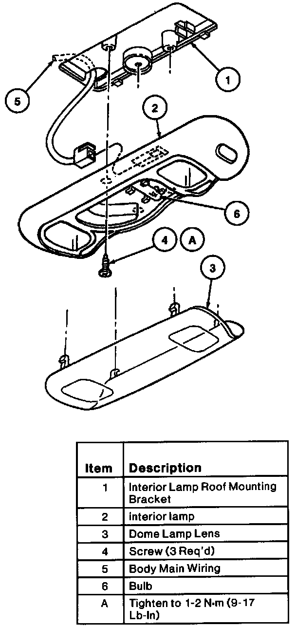 1. Remove the dome lamp lens and three screws that retain the interior lamp to its mounting surface.