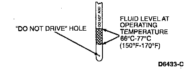 CAUTION: Vehicle should not be driven if the fluid level is below the bottom hole on the fluid level indicator and the outside temperature is above 10°C (50°F).
