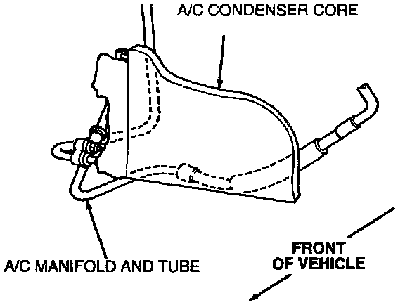 8. Disconnect A/C manifold and tube from A/C condenser core inlet tube. Plug the lines to prevent dirt and excessive moisture from entering.