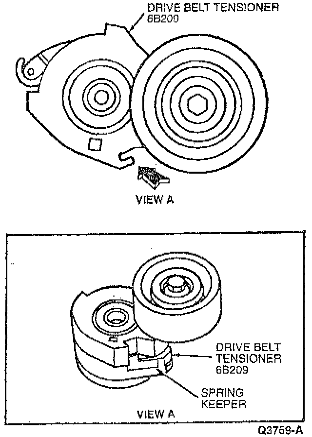 2. Rotate drive belt tensioner and install drive belt over drive belt tensioner pulley. Make sure that all V-grooves make proper contact with pulleys. Make sure spring keeper releases or improper belt tension will occur.