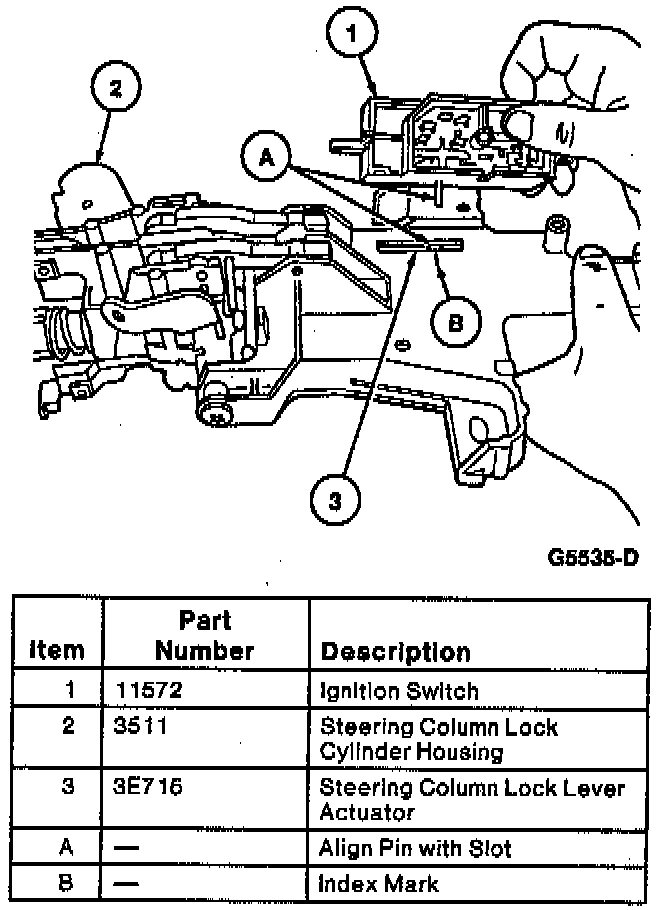 3. Install the ignition switch pin into the actuator. It may be necessary to move the ignition switch slightly back and forth to align the ignition switch mounting holes with the lock cylinder housing threaded holes.