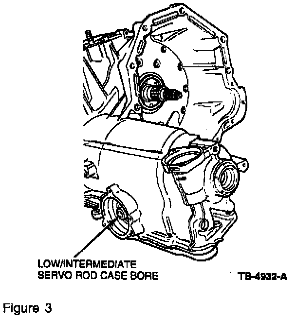 ^ Inspect the servo rod case bore for burrs and nicks. Refer to Figure 3. Replace the transaxle case if the low/intermediate servo rod does not move freely in the case bore due to a rough bore finish.