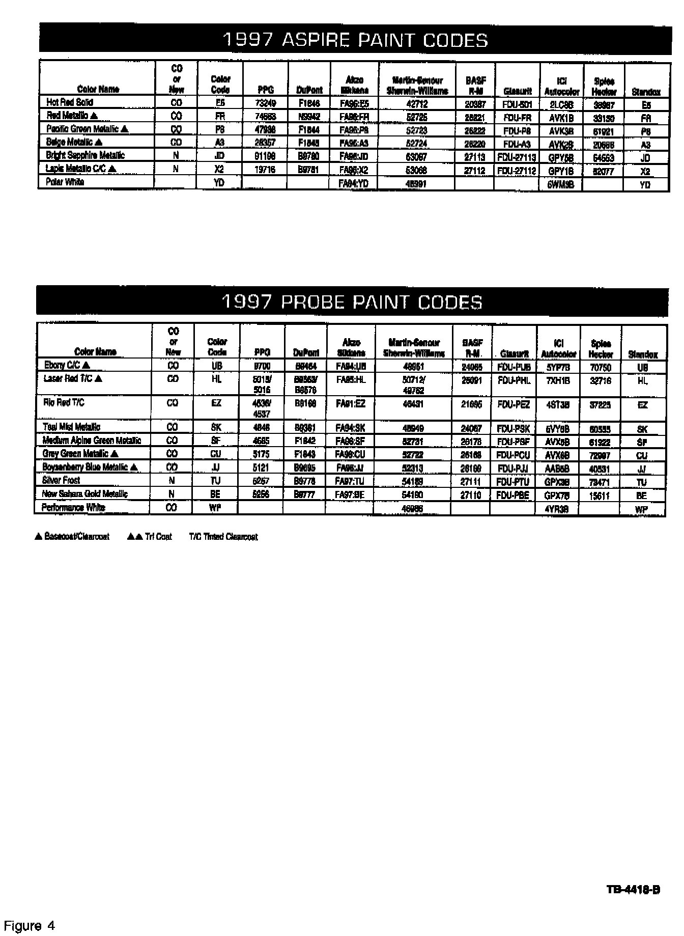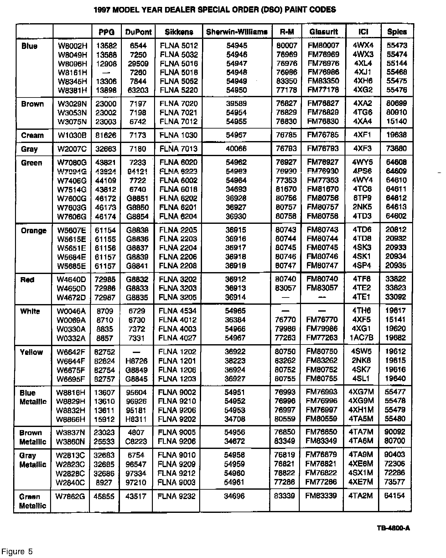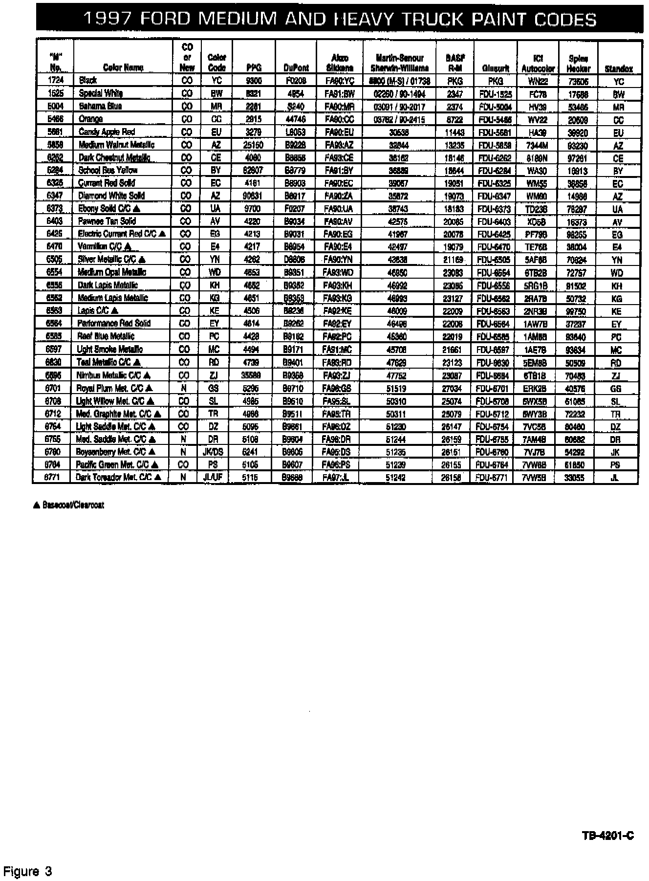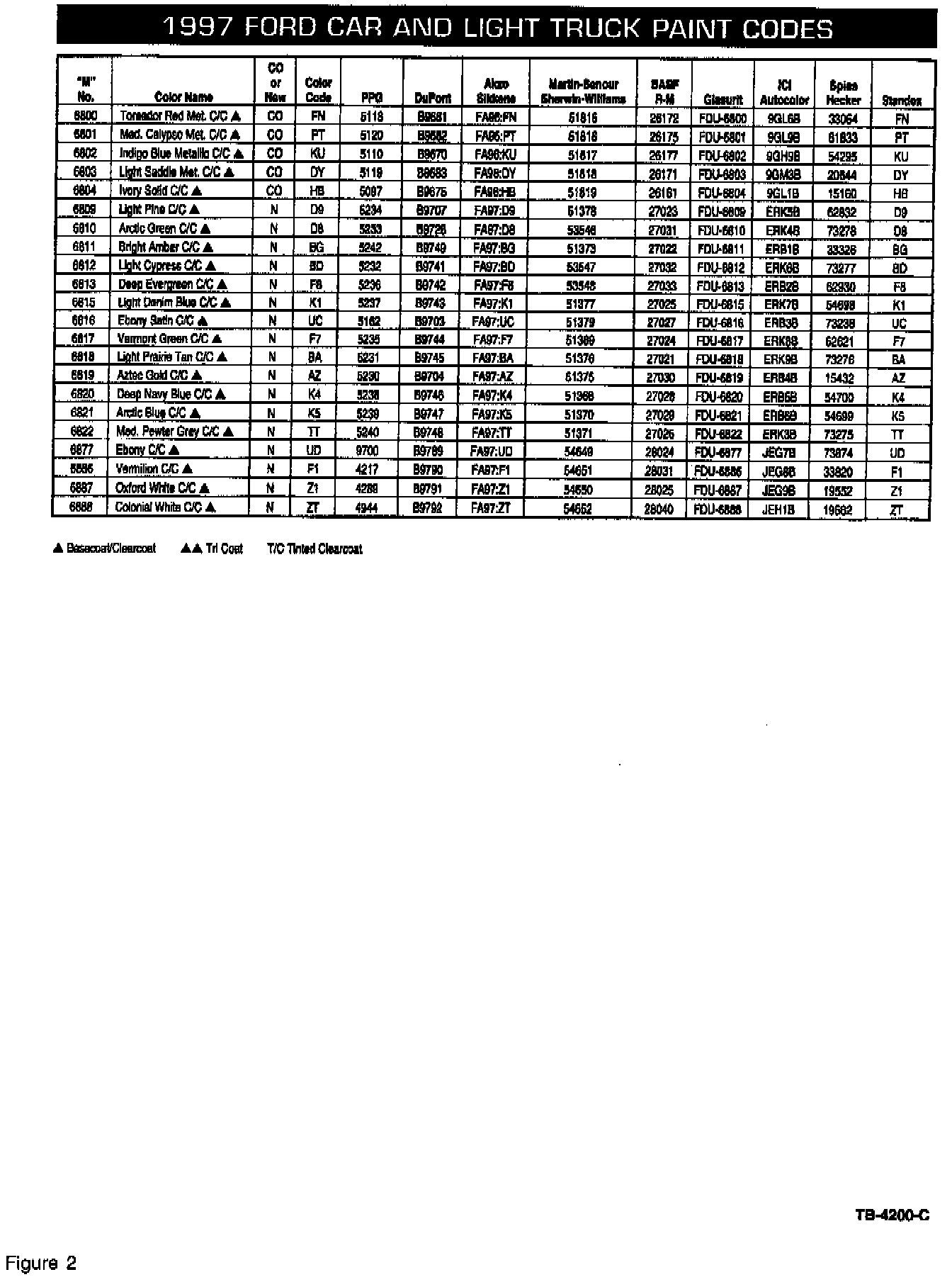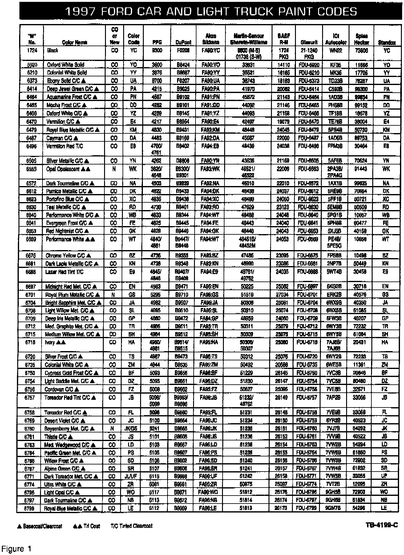 The 1997 Ford and Lincoln-Mercury color charts (Figures 1 through 5) provide all of the supplier paint code numbers for the Ford two-digit paint codes listed on the Vehicle Certification Label.