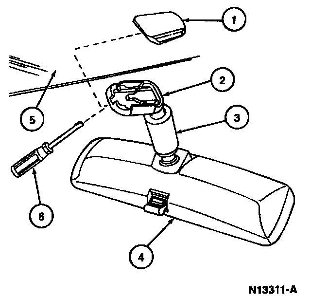1. Grasp inside rear view mirror firmly.2. Insert small flat-bladed screwdriver into slot in bottom of rear view mirror mounting pad.
