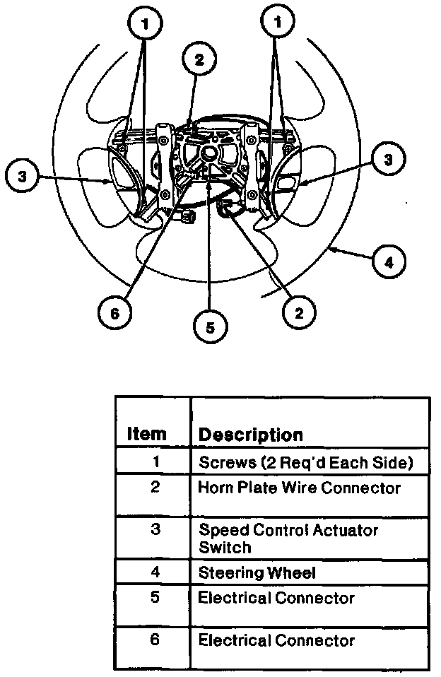 10. Disconnect one horn plate wire connector on each side of steering wheel. Disconnect single, in-line wire connector in purple wire at center of steering wheel. Remove four screws retaining LH and RH speed control actuator switches to steering wheel. Remove speed control actuator switches from steering wheel.