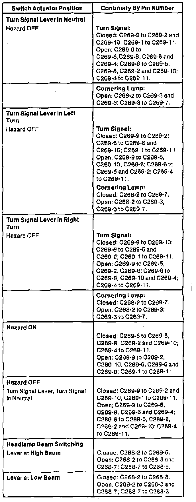 Refer to the symptom chart, the Multi-Function Switch connector illustration and Continuity Test Chart to resolve concerns with the multi-function switch.