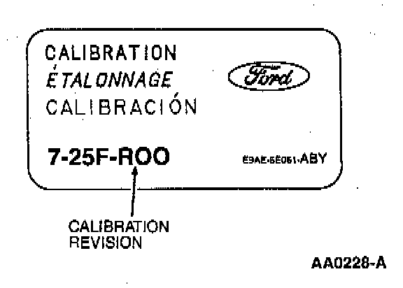 The emission calibration number label is located on the LH quarter latch pillar (28160). These numbers are used to determine if parts are unique to specific engines. Always refer to this label when replacement parts are required or when checking engine calibrations. It identifies the following:
