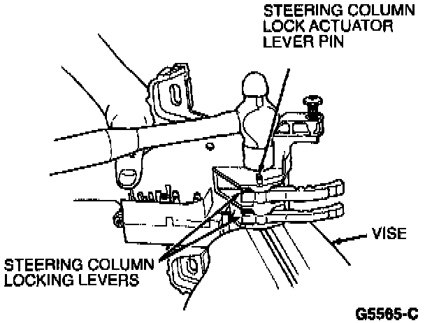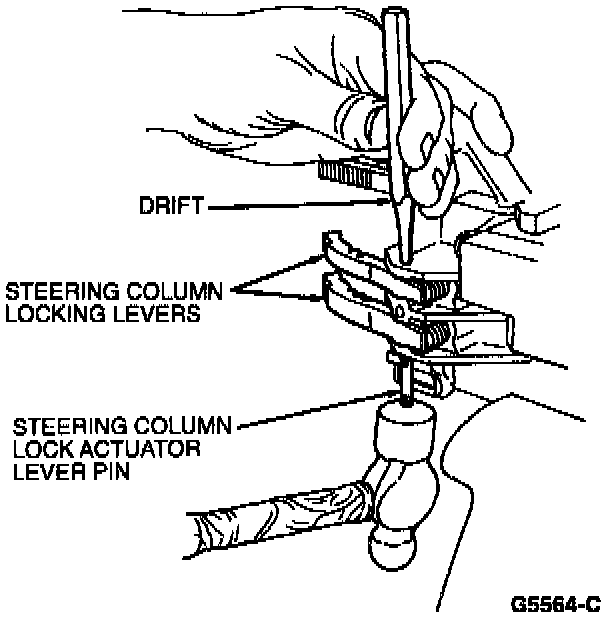 6. Install the other steering column locking lever spring and steering column lock left hand lever with pivot pin. Tap pin into place while driving out drift.