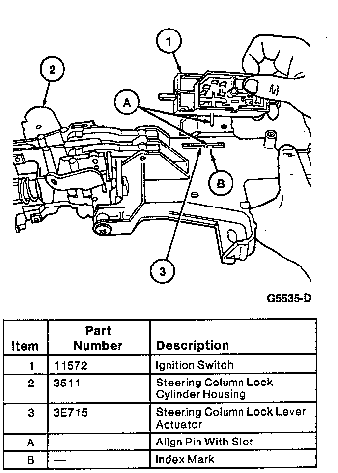 15. Install ignition switch. Align pin from ignition switch with slot in lock/column assembly. Position slot in lock/column assembly with index mark on casting. Tighten two retaining screws to 5-7 Nm (45-61 inch lbs.).
