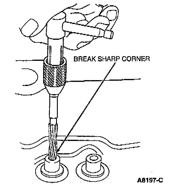 3. Use a suitable scraper to break the sharp corner (ID) at the top of the valve guide. Failure to do so may result in possible valve train wear and/or damage.