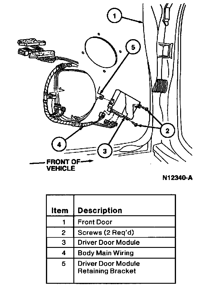 4. Remove two screws retaining driver door module to front door. Remove driver door module.