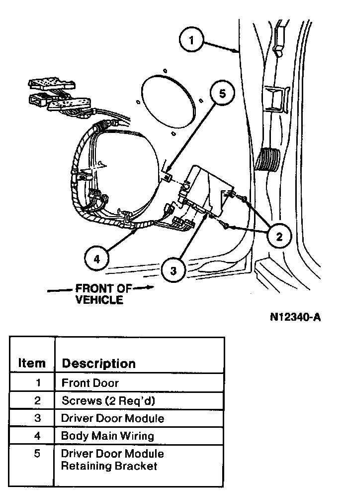 4. Remove two screws retaining driver door module to front door. Remove driver door module.