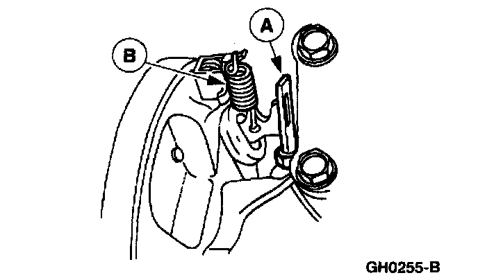 4. Disconnect the (A) parking brake cable and remove the (B) parking brake link spring.
