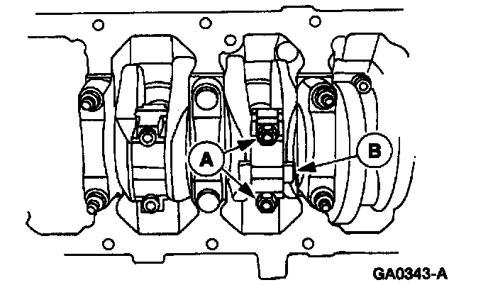 6. Remove the (A) two nuts, the (B) connecting rod cap and the lower connecting rod bearing.