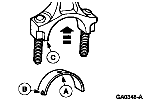 NOTE: When installing the (A) connecting rod bearing, ensure the (B) tab on the bearing engages the (C) slot in the connecting rod and that the bearing is fully seated.