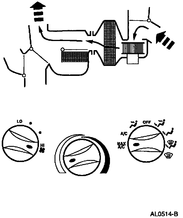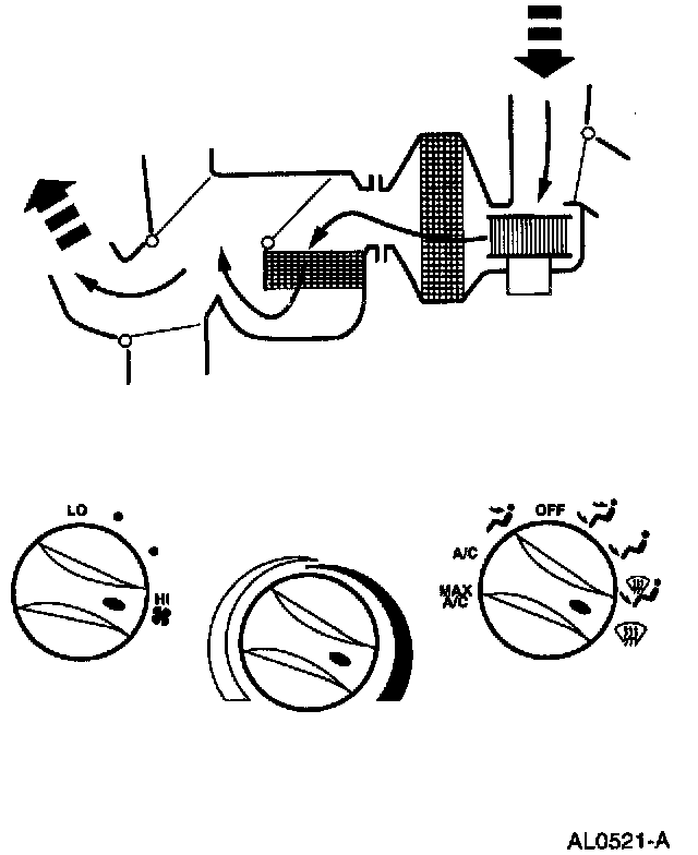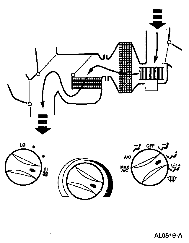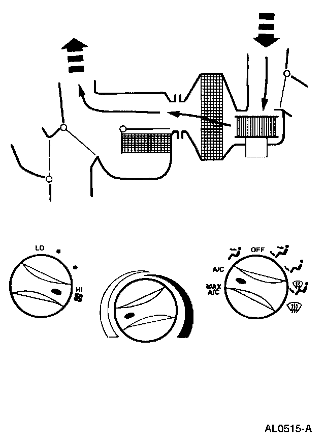 - Air will be picked up at the recirc opening by the blower motor. With the temperature control set for maximum cold, airflow across the A/C evaporator core will be diverted past the heater core and then directed into the passenger compartment through the instrument panel A/C registers.