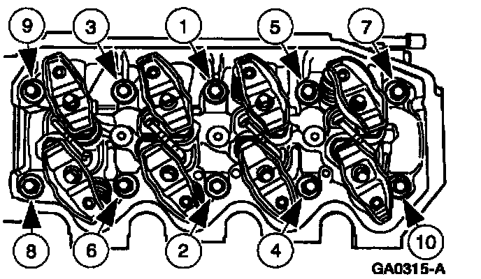 Install the cylinder head assembly and torque the cylinder head bolts in the following sequence.