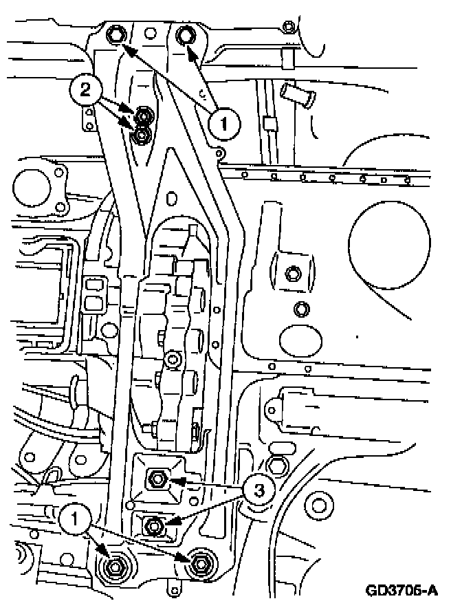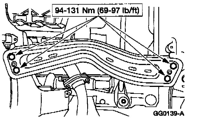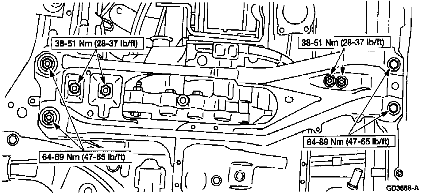1 Remove the transmission support crossmember bolts and nuts.