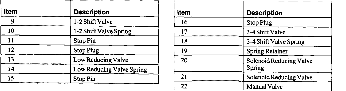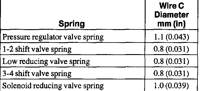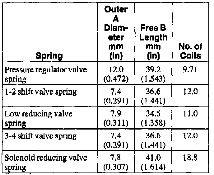 2. Measure the free length of the pressure regulator spring, 1-2 shift valve spring, low reducing valve spring, the 3-4 shift spring, and the 2-3 timing valve spring. For spring specifications, use the spring specification chart.