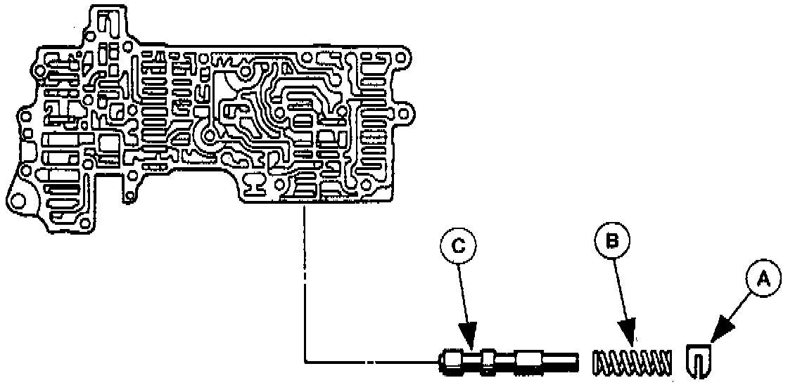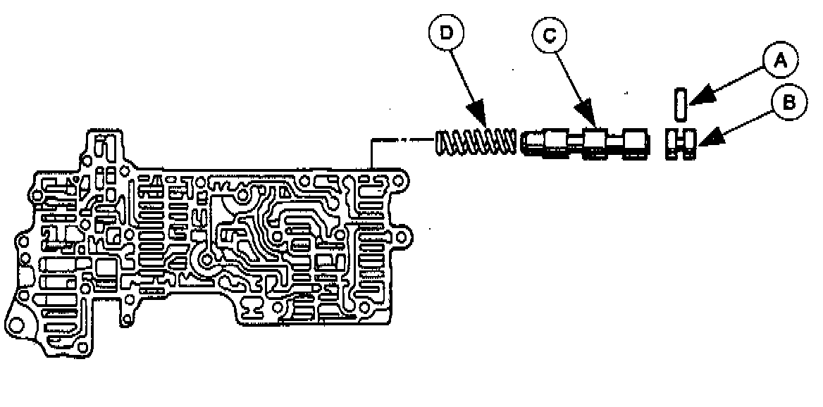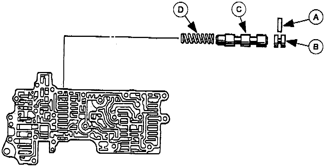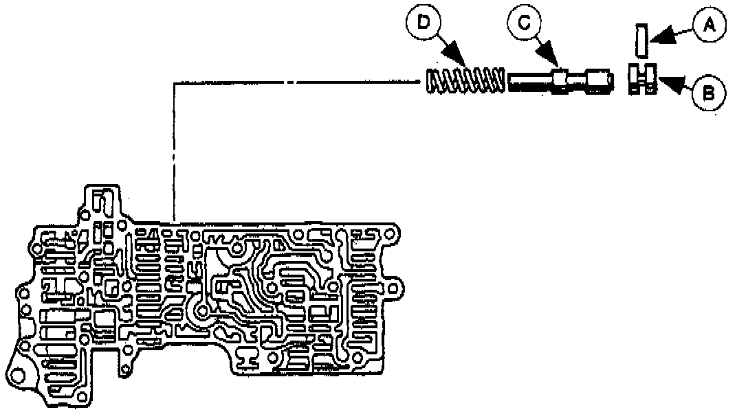 2. Remove the (A) stop pin, (B) stop plug, (C) 1-2 shift valve, and the (D) 1-2 shift valve spring.