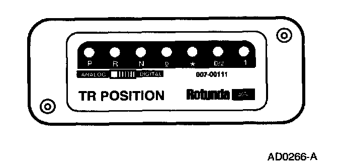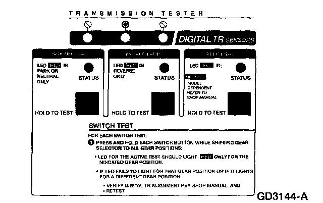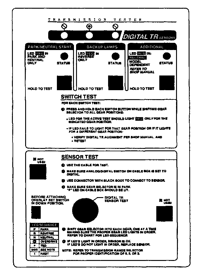 INTRODUCTIONThe Transmission Tester and TR Testing Cable "E" 418-F107 (007-00111) or equivalent with Digital TR Sensor Overlay 007-00131 or equivalent allows a technician to test the digital TR sensor independent of vehicle electronics. Digital TR sensor testing is divided into four steps: