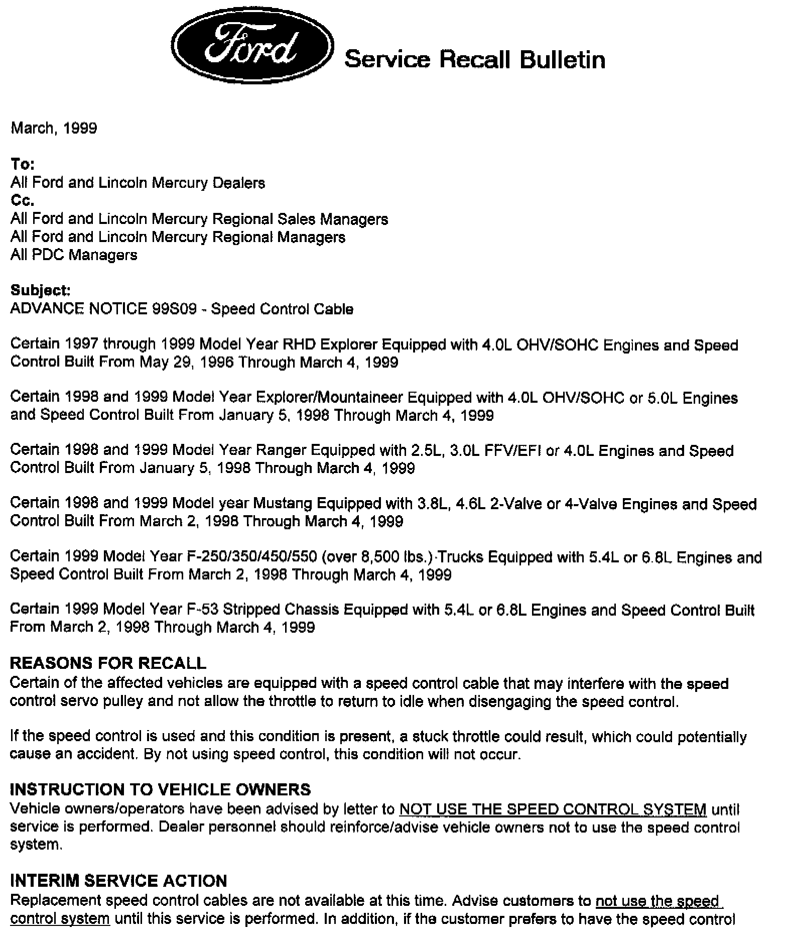 Recall - Speed Control Cable Replacement