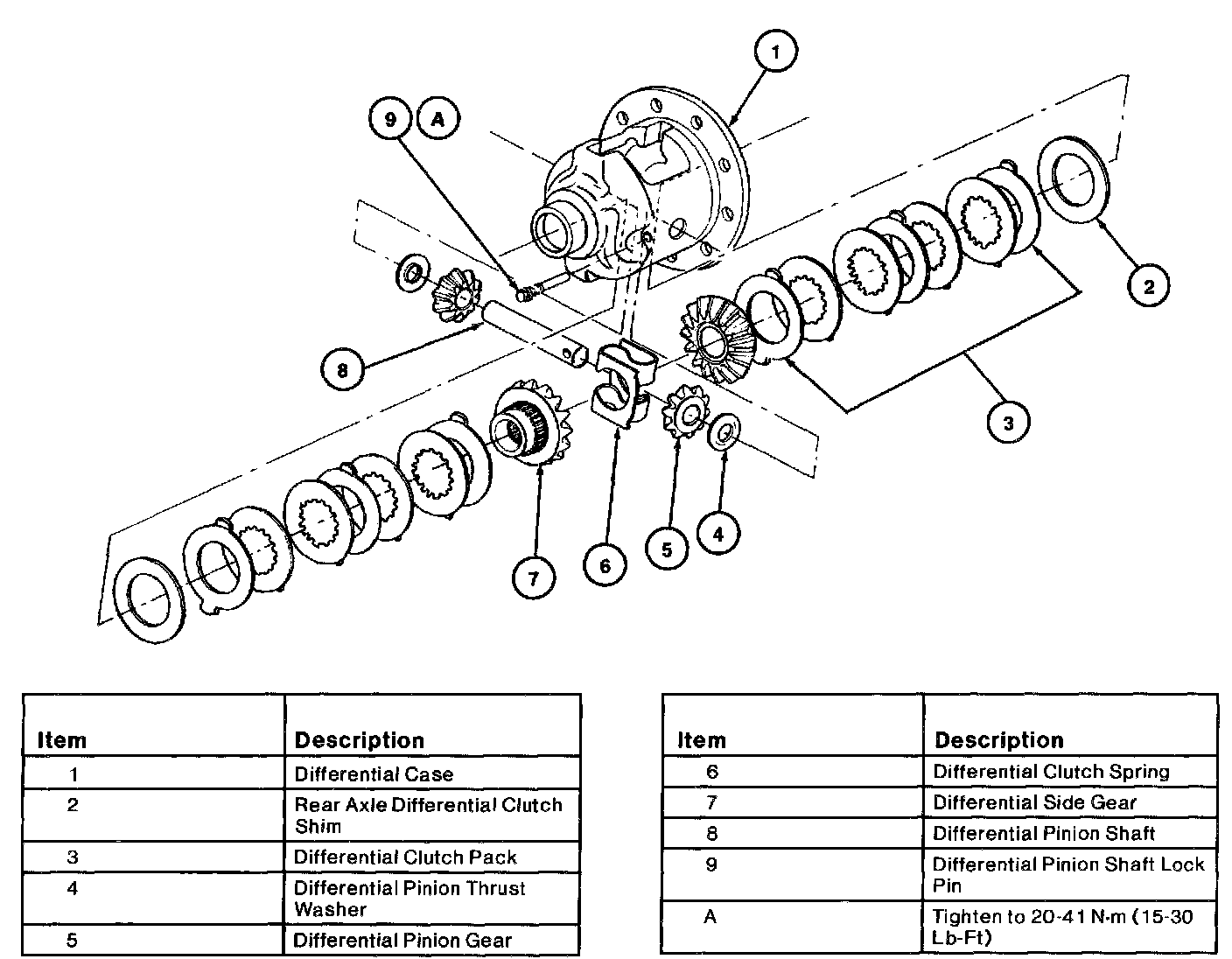 ^ The four steel plates are splined to the differential side gear hub, which is splined to the axle shaft. The three friction plates have tabs that fit in the differential case so the differential clutch pack are always engaged. For correct stacking of differential clutch pack refer to exploded view of Traction-Lok differential assembly.