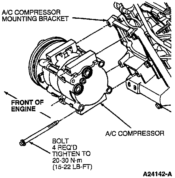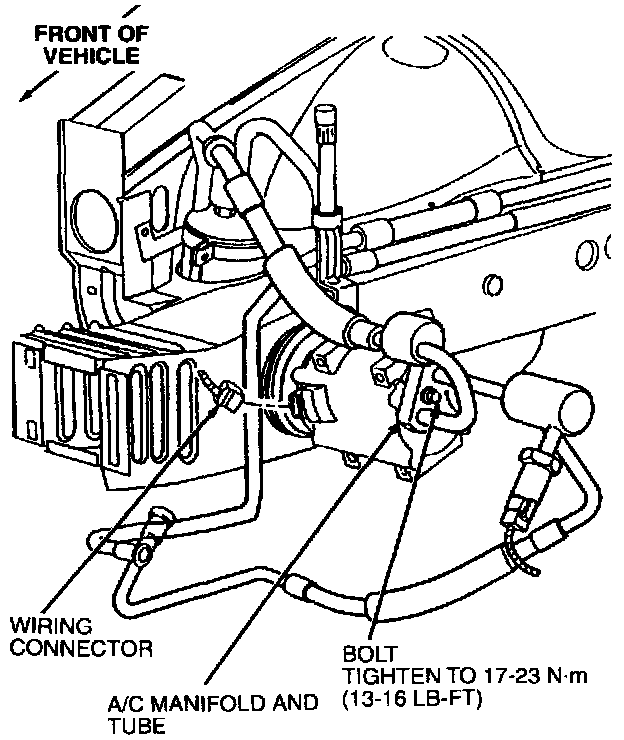 5. Position A/C manifold and tube with O-ring seals to A/C compressor. Install retaining bolt and tighten to 17-23 N.m (13-16 Lb-Ft).