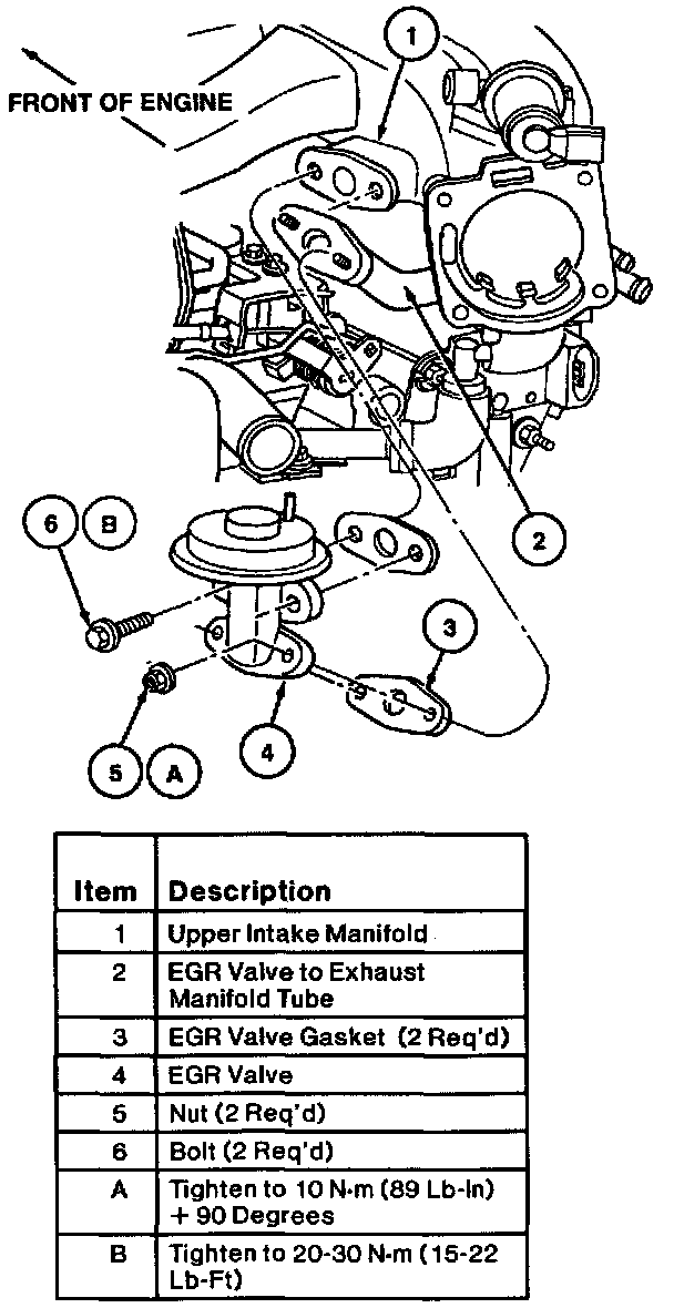 3. Install new EGR valve gasket and two bolts retaining EGR valve to the upper intake manifold.
