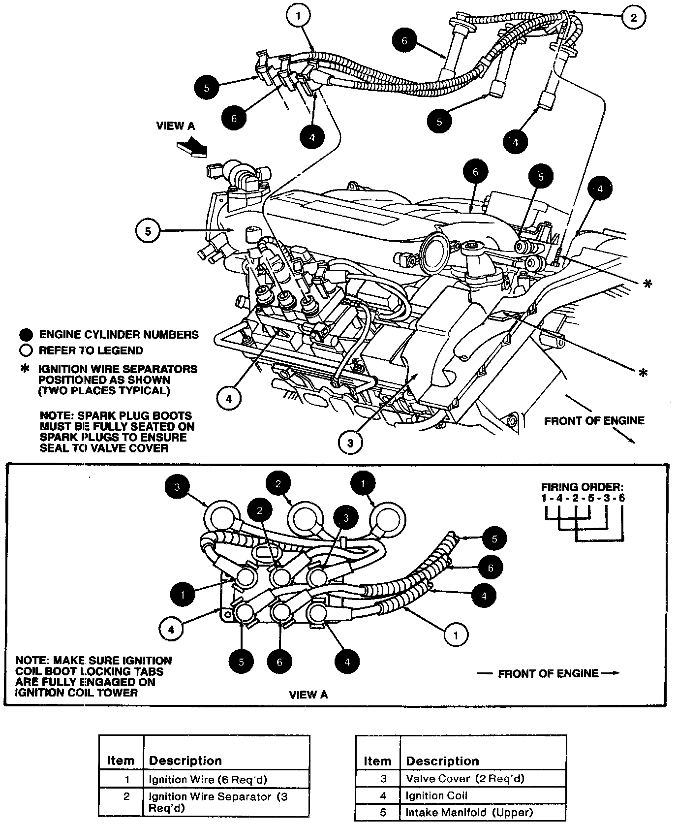 2. Install each ignition wire to the proper terminal on the ignition coil. The terminals on the ignition coil are numbered. Make sure the ignition coil boots are fully seated and that both ignition coil boot locking tabs are engaged.