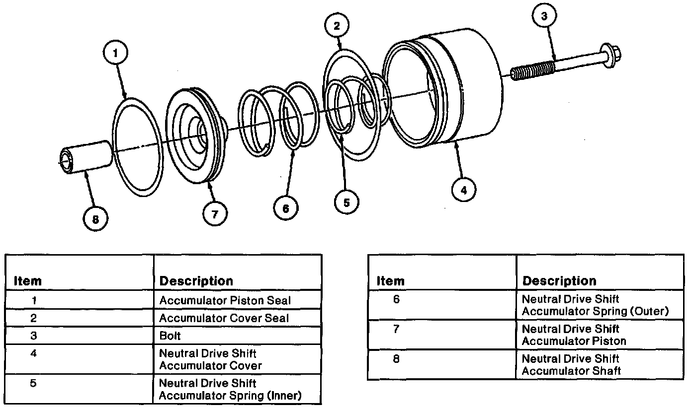 1. Disassemble neutral drive accumulator cover springs, piston and rod. Inspect parts for damage. Service as required.