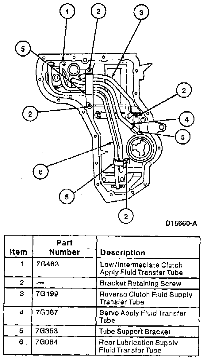 57. Install new O-rings as necessary and install low/intermediate clutch apply fluid transfer tube.