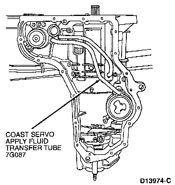 56. Install new O-rings as necessary and install coast servo apply fluid transfer tube.