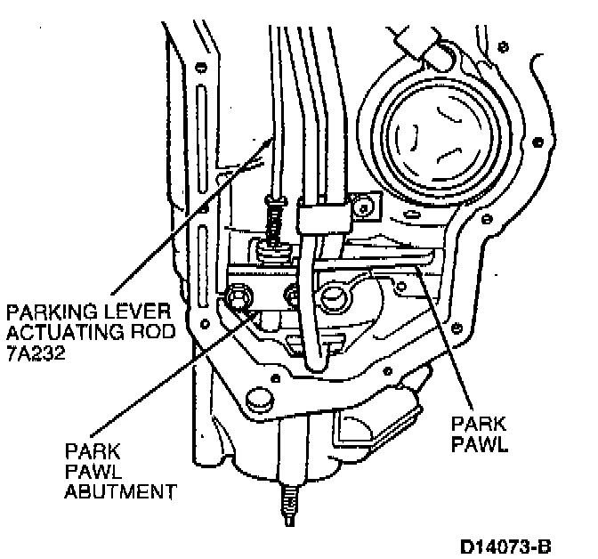 61. Install parking lever actuating rod in case. Push in parking pawl and locate rod between parking pawl and abutment.