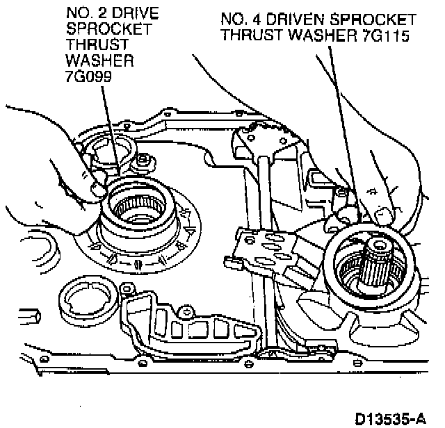 64. Install No. 2 drive sprocket thrust washer and No. 4 driven sprocket thrust washer onto drive and drive sprocket supports. Align tabs on thrust washers with holes in sprocket supports. Apply petroleum jelly to washers to help hold in position.