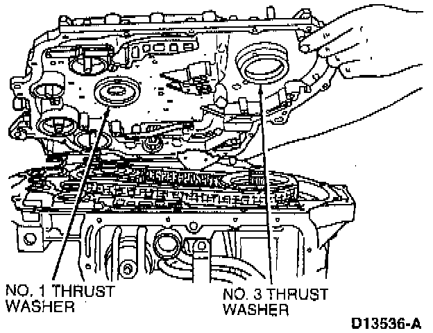 NOTE: No. 1 and No. 3 thrust washers installed in previous step must stay installed to case. If accumulator piston shafts fall out of chain cover, reinstall to their bores.