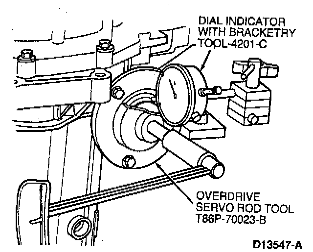 74. Install Overdrive Servo Rod Tool 307-162 (T86P-70023-B) and secure using servo cover bolts. Tighten bolts to 9-12 Nm (80-106 in lb). Install Dial Indicator With Bracketry 100-002 (TOOL-4201-C) or equivalent as shown.