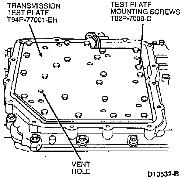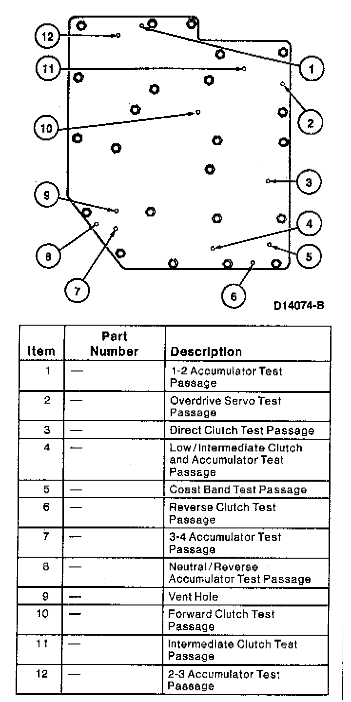 NOTE: When applying regulated 276 kPa (40 psi) air pressure to the appropriate passage, a dull thud should be heard when the clutch or band applies. There should be no hissing sound when clutch or band is applied. Cover the vent hole in the test plate with a clean, lint-free shop towel to prevent spray when air is applied. Plugging vent hole during testing will result in inaccurate results.