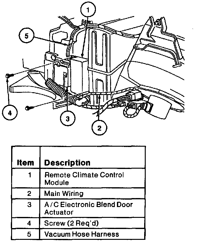 1. Position remote climate control module near A/C electronic blend door actuator. Connect wiring connector and vacuum hose harness to remote climate control module.