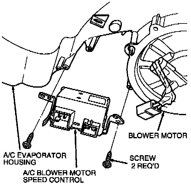 4. Remove two screws retaining A/C blower motor speed control to A/C evaporator housing and remove A/C blower motor speed control.