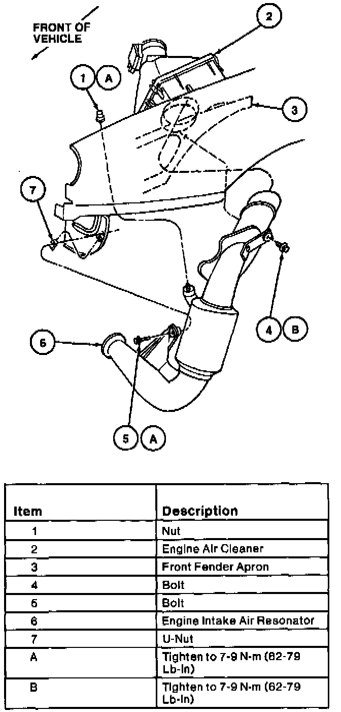 2. Tighten upper engine air intake resonator retaining bolt to 6-7 Nm (54-61 inch. lbs.). Tighten lower retaining bolt and retaining nut to 7-9 Nm (62-79 inch. lbs.).