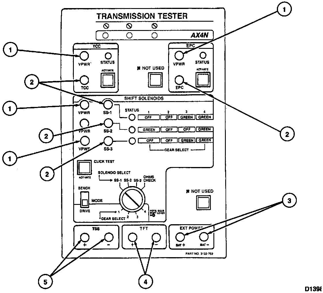 Use Rotunda Transmission Tester 007-00130 and 418-FO42 (007-00117) and Rotunda AX4N Transmission Tester Update 007-00105 and Digital TR Sensor Overlay 007-00131 with Rotunda Transmission Range (TR) Sensor Cable "E" 418-F107 (007-00111) or equivalent to diagnose electronically controlled transaxles. The following instructions outline the set-up and use of this tester in the pinpoint tests for the AX4N.