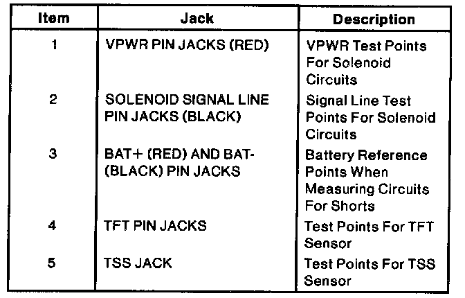2. Solenoid (TCC, EPC) Signal Line Pin Jacks (Black): Signal line test points for solenoid circuits.