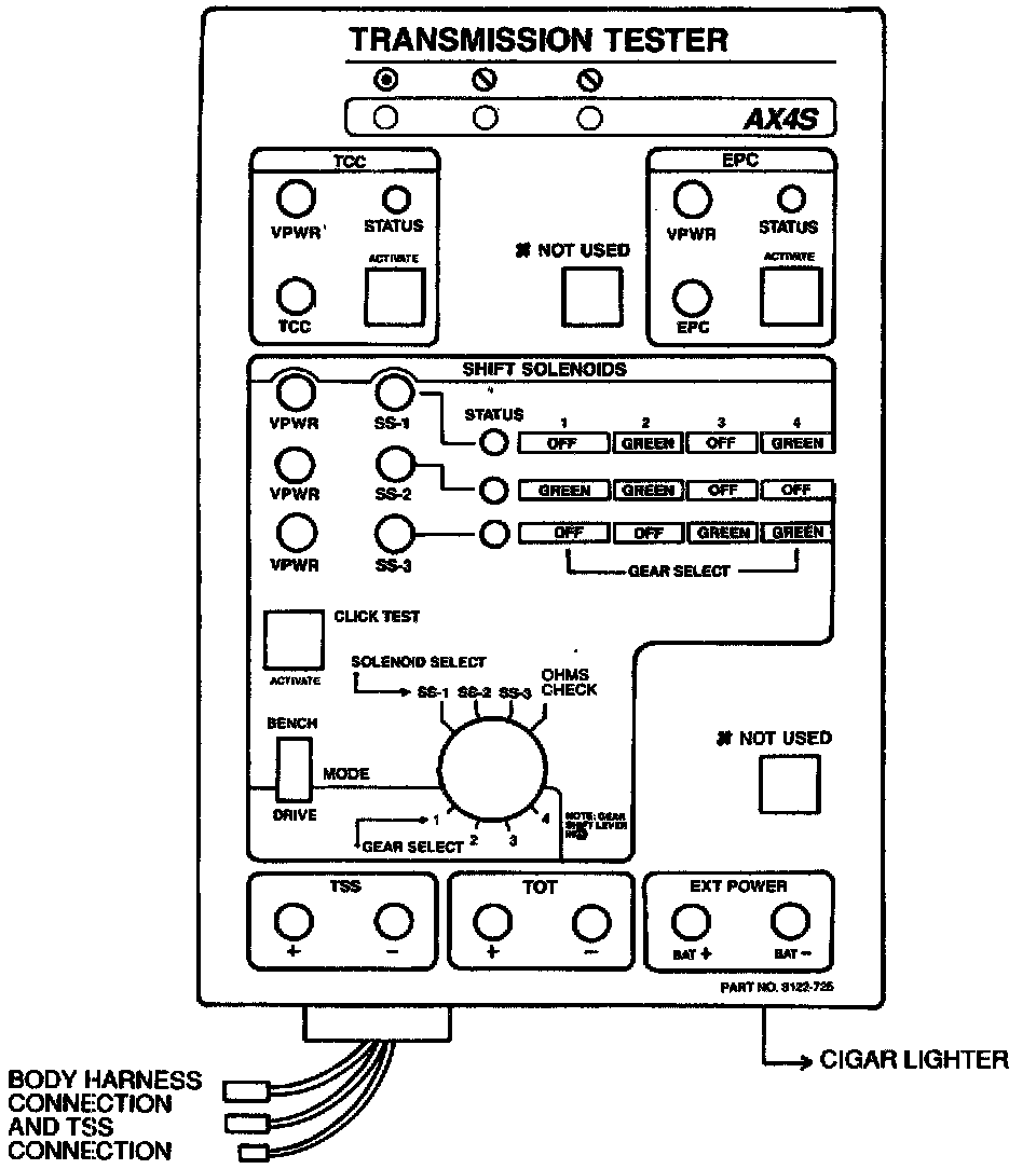 Use Rotunda Transmission Tester 007-00130 007-00130 with AX4S cable and overlay 418-F029 (007-00087) (007-00087) or equivalent to diagnose electronically controlled transaxles. The following instructions describe the set-up and use of this tester in the pinpoint tests for the AX4S.OVERLAYS AND ADAPTERS