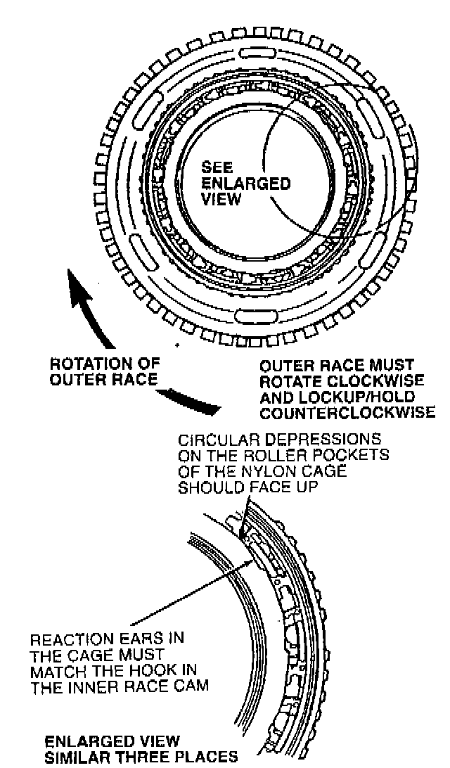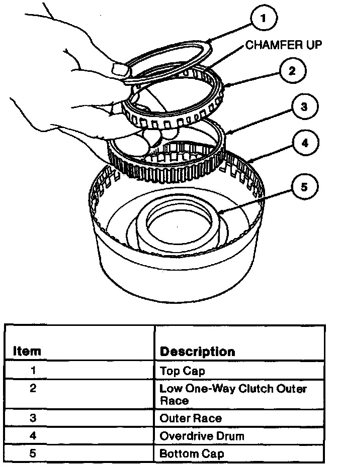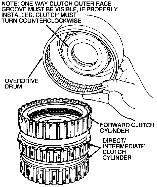 9. Clean and inspect low one-way clutch components. Assemble and install low one-way clutch into overdrive drum with chamfer up.