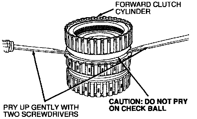 NOTE: Direct clutch hub O-ring seals retain forward clutch on hub. Pry evenly and do not locate screwdriver ends on or near forward clutch check ball.
