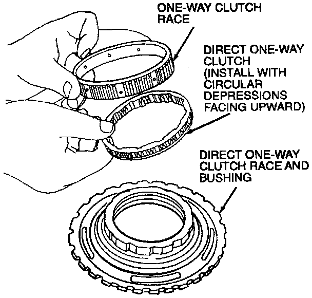 15. Clean and inspect direct one-way clutch components. Assemble direct one-way clutch with circular depressions facing upward.