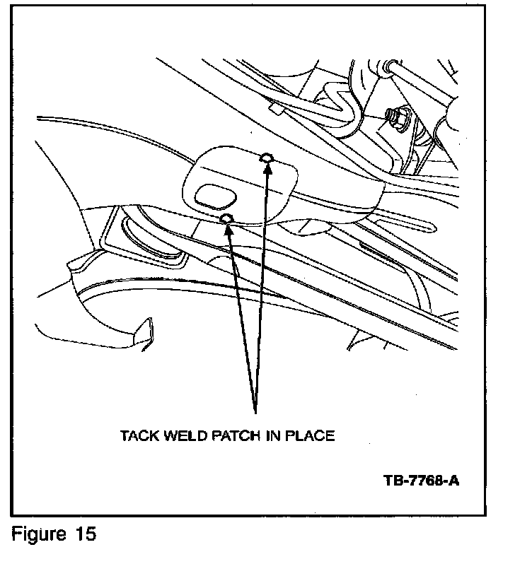 8. Center the slot of Reinforcement Patch (4W73-5A123-AA right hand side marked "R") or 4W73-5A124-M left hand side (marked "L") to the center of the trailing arm bolt taking care that the frame rail does not overlap the slot (Figure 14). Tack in place, then weld around the reinforcement plate completely (Figure 15 and 16).