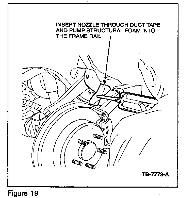7. Insert the nozzle through the hole cut into the duct tape in the outside tooling hole (Figure 19). Pump the tube of Structural Foam into the frame rail. When the Structural Foam rises to the height of the tooling hole, it will be necessary to duct tape the hole when switching tubes to prevent leakage of the Structural Foam.