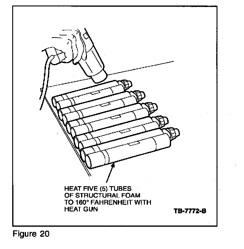 5. Put the five (5) tubes of 1U2J-19554-DA Motorcraft Structural Foam on a table and heat the tubes front and back with a heat gun to approximately 71.1 °C (160 °F). This will help soften the two parts of the Structural Foam so that it will flow out of the tubes and through the mixing wand easily (Figure 20).